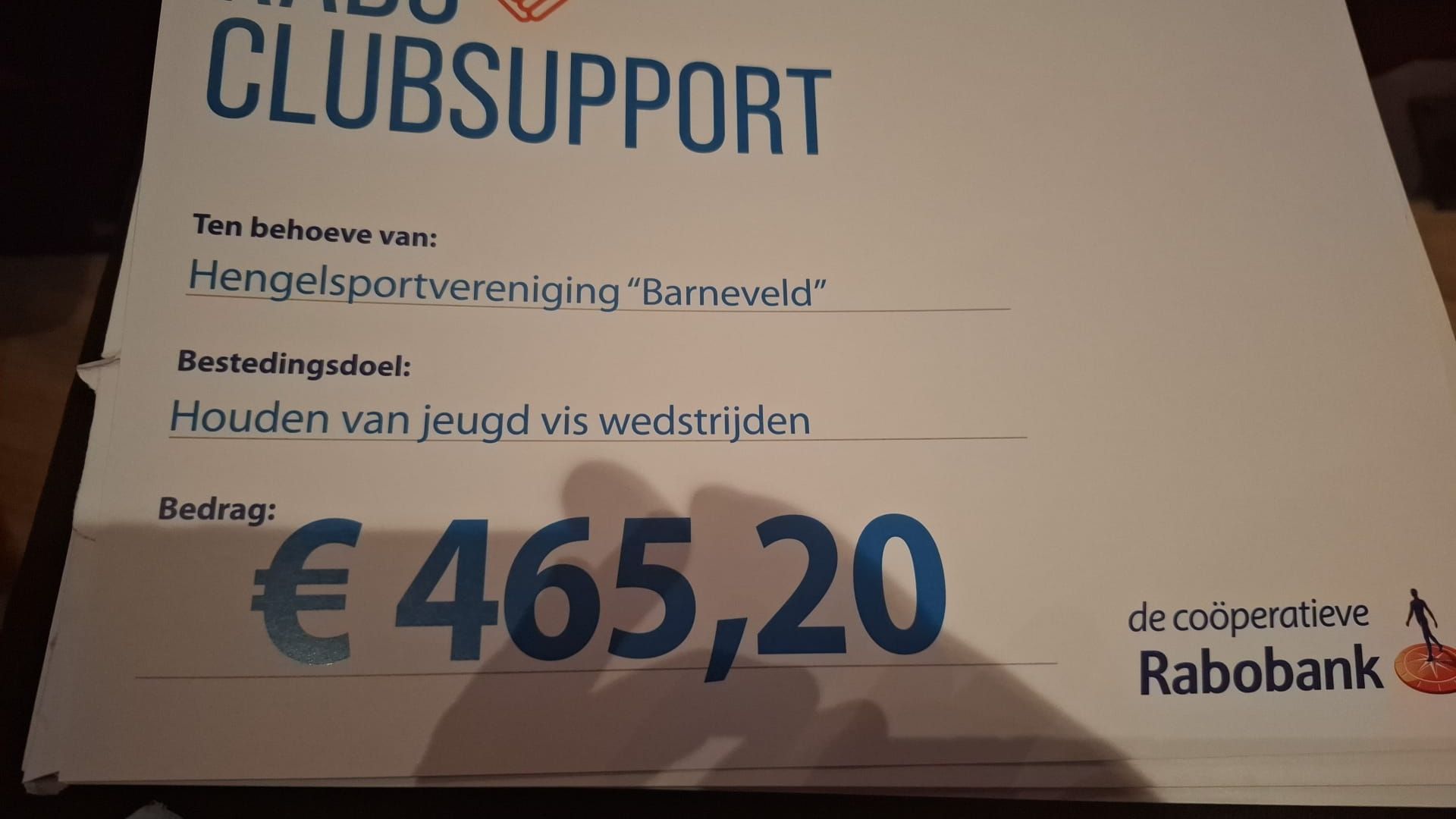 Dankzij de stemmen van onze leden en supporters heeft Hengelsportvereniging Barneveld een prachtig bedrag van €465,20 ontvangen via de Rabo ClubSupport-actie!